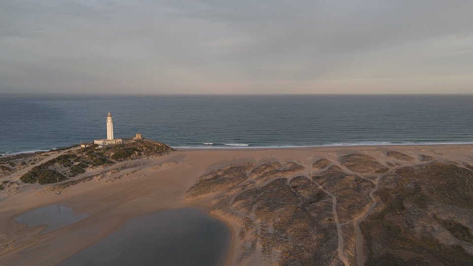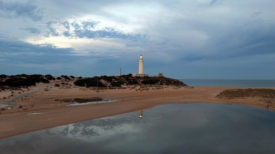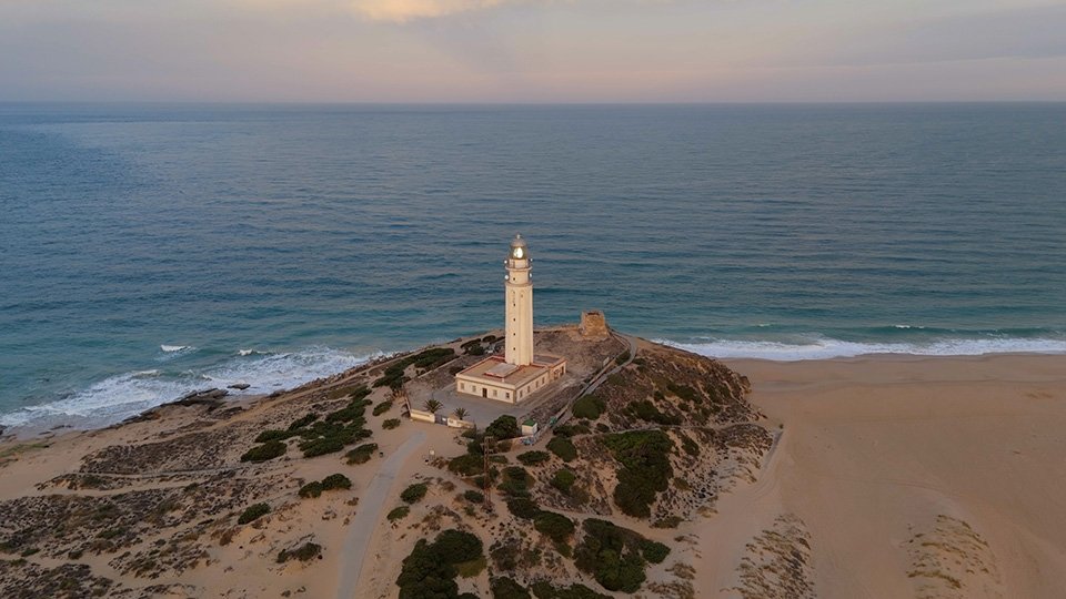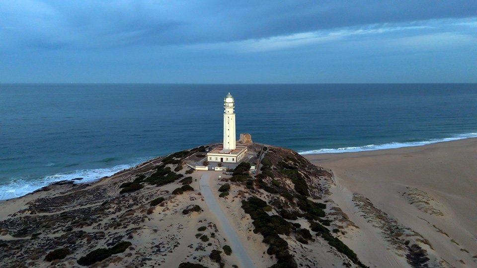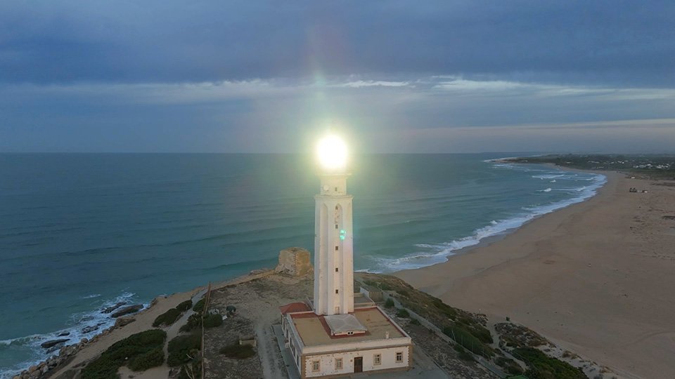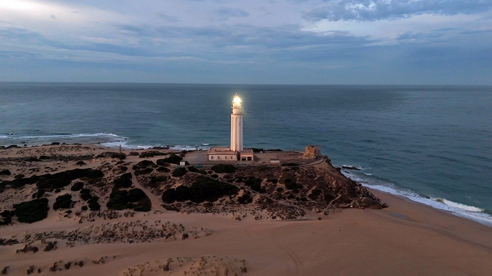 Vuelo de madrugada en el fantástico Trómbolo de Trafalgar. El Faro de Trafalgar: majestuosidad, historia y belleza en el Atlántico.