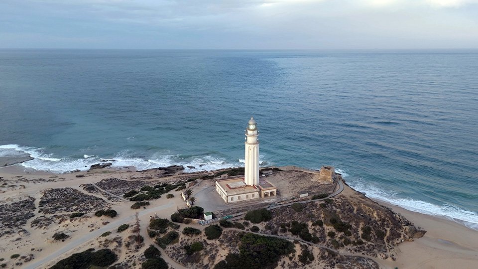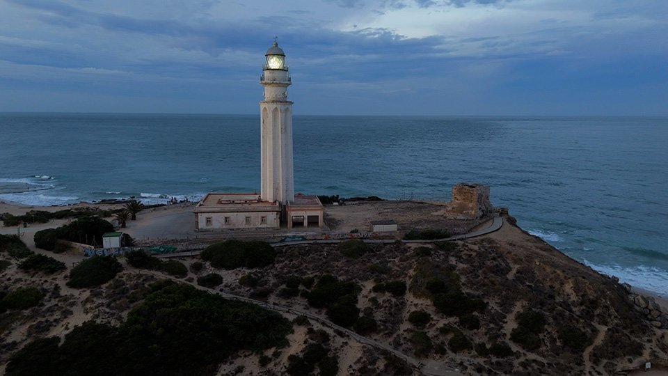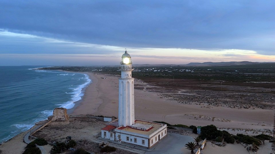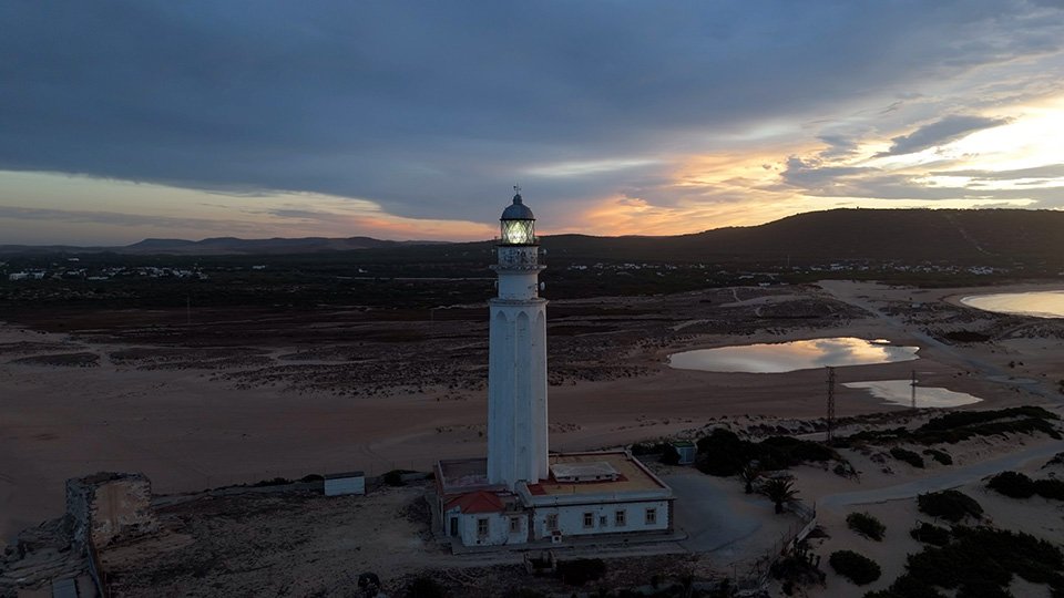 Vuelo de madrugada en el fantástico Trómbolo de Trafalgar. El Faro de Trafalgar: majestuosidad, historia y belleza en el Atlántico.